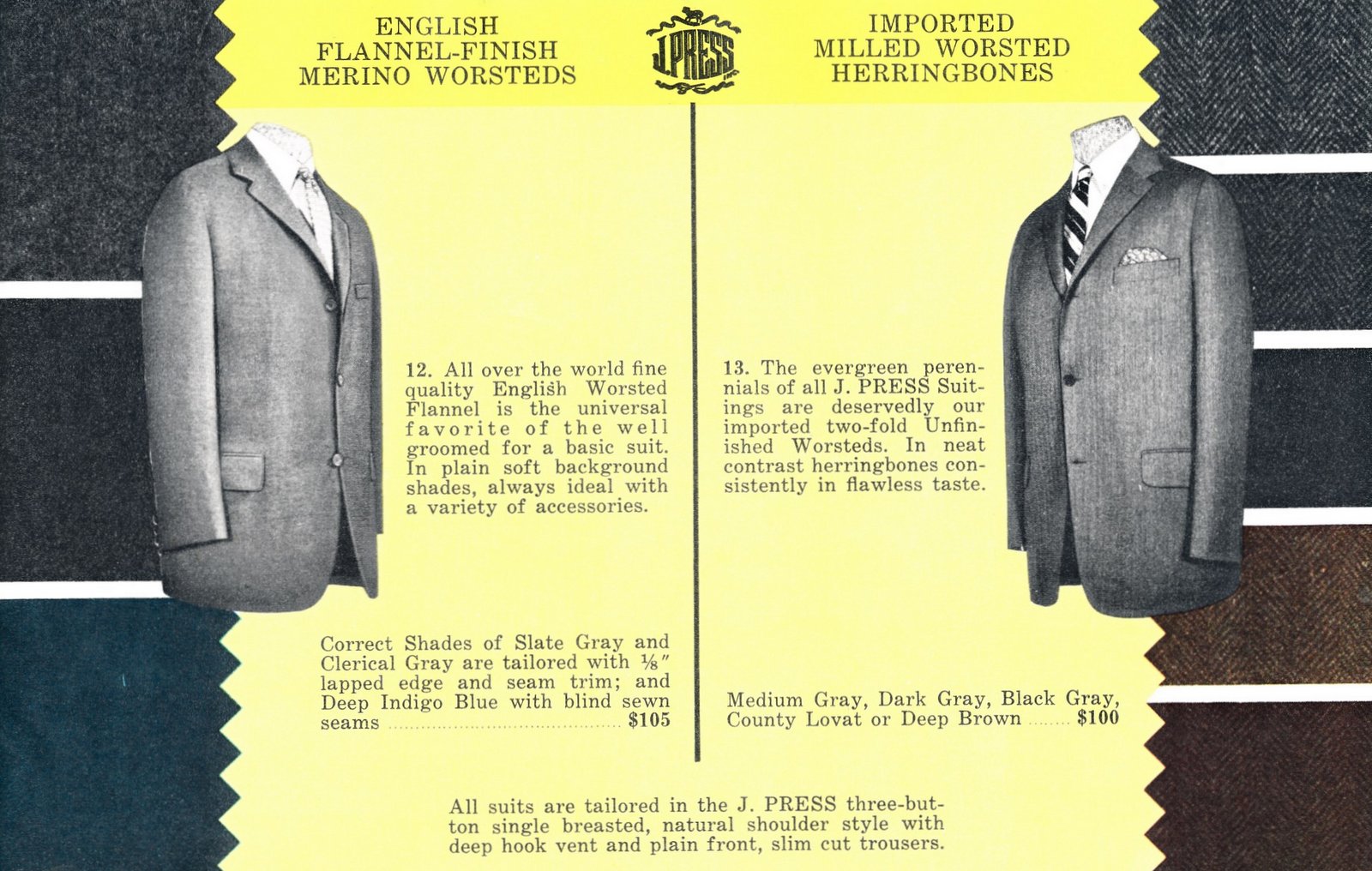 Alan Flusser wrote that the ideal lapel width is halfway through the length of the jacket. J. Press’s skinny lapels look out of proportion, juvenile, and like they tried to penny-pinch on fabric.