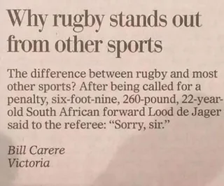 When comparing rugby to association football, or soccer, fans invoke a quote attributed to Winston Churchill (perhaps apocryphally): “…one is a gentleman’s game played by hooligans; the other a hooligan’s game played by gentlemen.” The film Invictus accurately portrays rugby as the choice upper-class sport in 1995 South Africa. Moreover, rugby players are customarily deferential to referees. When an ornery Tobias Botes raised his voice during a Treviso versus Munster match, Referee Nigel Owens famously told Botes, “I don’t think we’ve met. I’m the referee here, not you… If I hear you shouting again, I will be penalizing you. This is not soccer.”