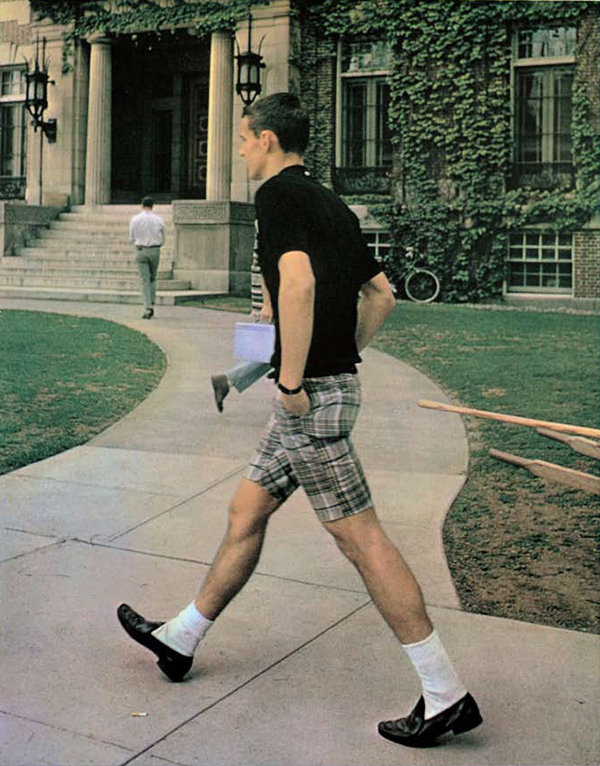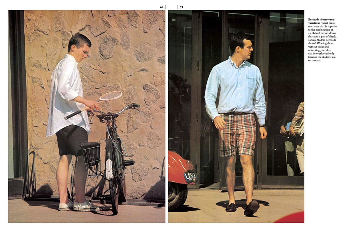 Most of the Yale shots are taken in from of the campus bookstore on Broadway, just up the block and across the street from the current J. Press location. The then-brand-new edifice, designed by Eero Saarinen, is noteworthy for its brutalist take on Yale’s predominate Campus Gothic architecture, contiguous to Ezra Stiles and Morse colleges. In a side-by side full-page color layout of two male students there – one with a squash racquet about to jump on his battered single-gear bicycle – the caption reads “What can a man wear that is superior to the combination of an Oxford button-down shirt and a pair of check, Indian Madras Bermuda shorts? Wearing shoes without socks and untucking your shirt can be overlooked only because the students are on campus.”