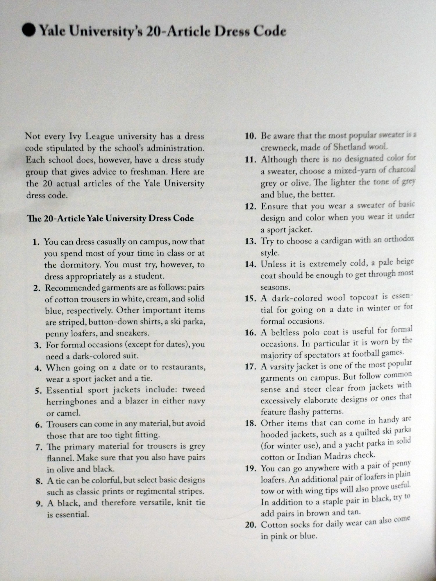 As many others have written, and with which I agree, while seemingly restrictive, such guides actually provide a measure of freedom, especially to those who did not come to Yale or other Ivy campuses from private or boarding schools with a strict dress code. Just get these and do this, the codes transmit, and you’ll be all set. You won’t have to worry about what clothes further. You’ll be fine.