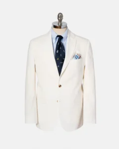Red, white, and blue are patriotic and also nautical. The burgee of my yacht club features these colors. The navy blazer with Nantucket Reds is a classic look. This salmon colored sport coat allows one to reverse the color scheme. I will make sure to wear it with a white OCBD and my navy necktie with yacht club burgees.
