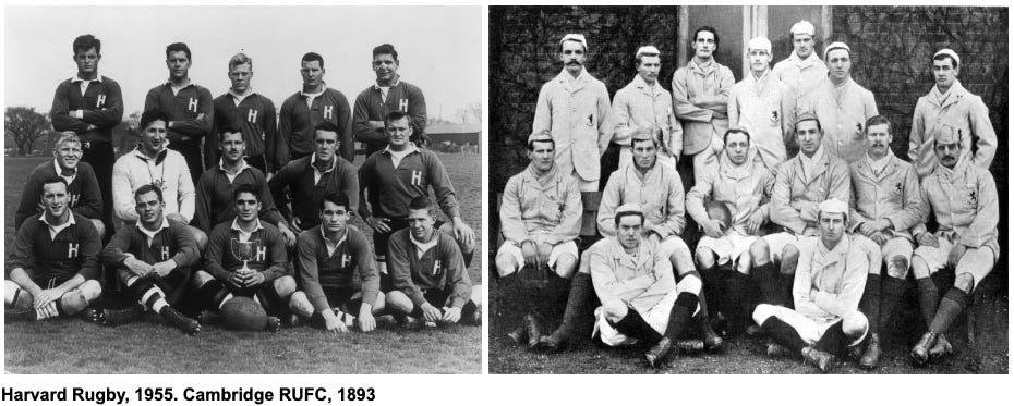 Englishness abroad, a via media between football styles, and aggressive traditions by unaggressive congregants. Rugby connects a certain New England to a certain Old England.