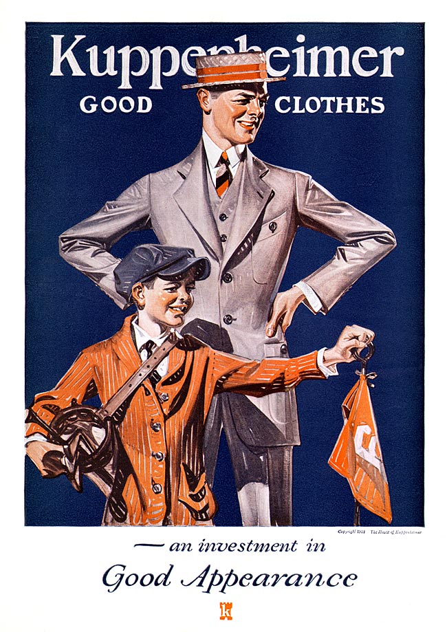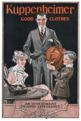 J. C. Leyendecker (1874-1951) illustrated covers for The Saturday Evening Post and Collier’s Weekly, in addition to his advertising work for brands like Arrow and Kuppenheimer. Leyendecker is clearly the illustrator that Fitzgerald had in mind in The Great Gatsby (1925). Fitzgerald uses the “Arrow Collar Man”— a popular 1920s advertising icon designed by Leyendecker—as a symbol of Jay Gatsby’s meticulously crafted, polished persona. Daisy Buchanan explicitly compares Gatsby to this handsome, well-dressed ideal when she compliments him stating, “You always look so cool . . . You resemble the advertisement of the man . . .” Many of Leyendecker’s illustrations feature clean cut collegians dressed stylishly in three-piece suits.