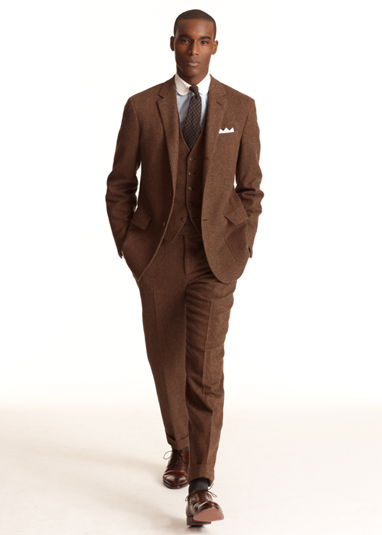 About two decades ago, I bought a beautiful three-piece suit at Brooks Brothers. It was made of a heather brown Donegal tweed. The jacket was a 3/2 roll natural shoulder sack. The trousers were plain front with 1 1/4” cuffs. The waistcoat had lapels. This three-piece suit was, in a word – perfect.