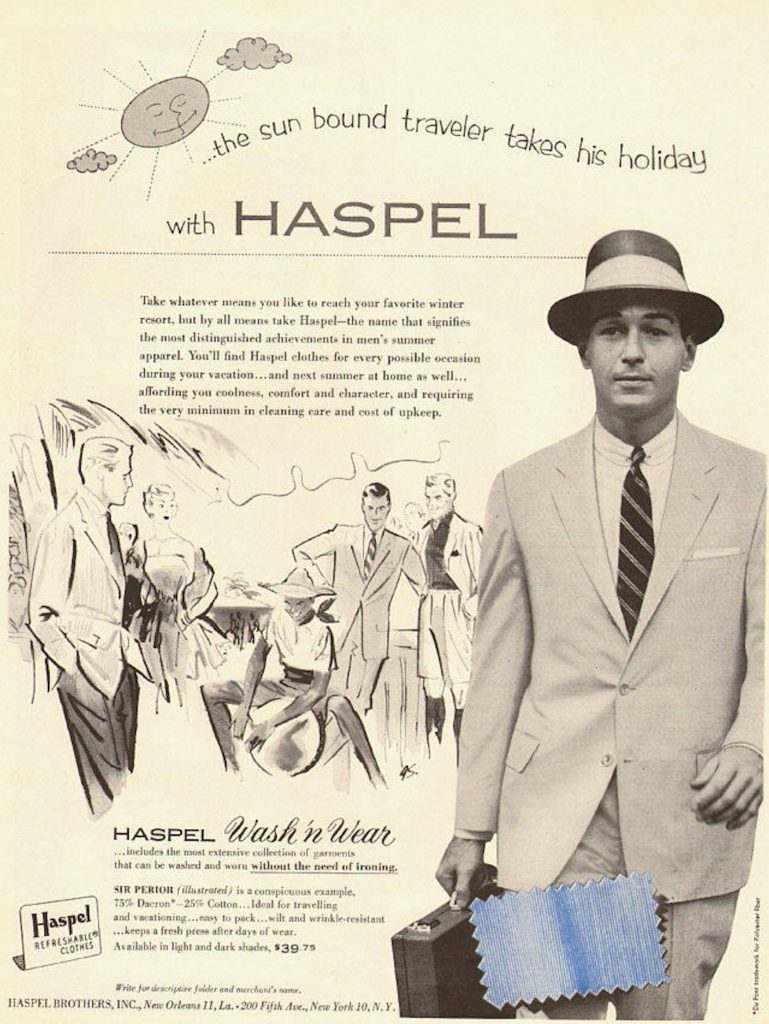 Pictured is an undated advertisement from Haspel, the great popularizer of seersucker. Haspel also innovated the concept of “wash-and-wear” among tailored clothing, which allowed you to throw your suit coats and trousers into the laundry along with your socks and underwear. And why stop there? Last week Fast Company reported on a new trend for clothing that doesn’t need to be washed at all — or at least very rarely.